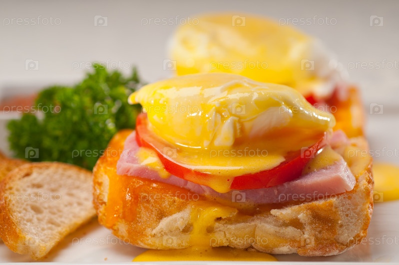 Яйца бенедикт на хлебе с помидорами и ветчиной
