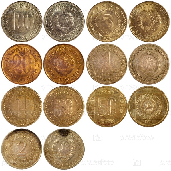Старые античные монеты Югославии, изолированные на белом фоне
