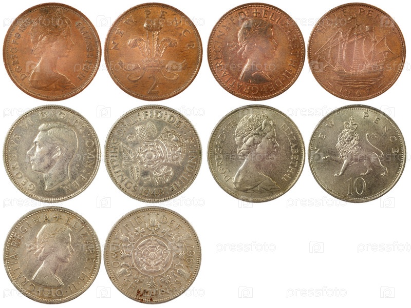 Различные редкие монеты Великобритании, изолированные на белом фоне