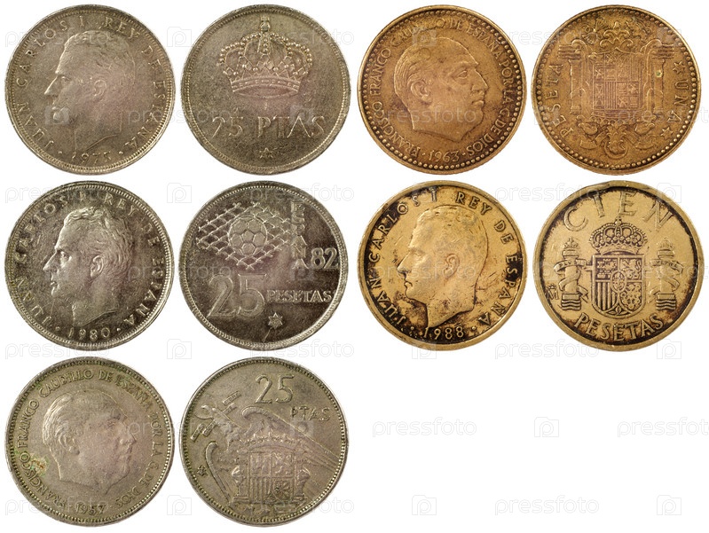 Различные редкие монеты Испании, изолированные на белом фоне