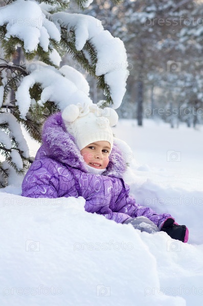 Девочка сидит под ветками заснеженного дерева