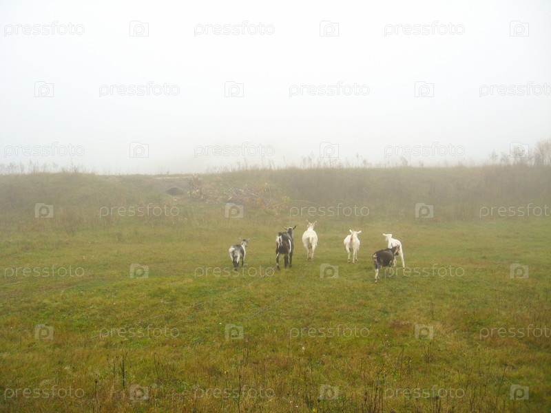Стадо коз на поле с туманом