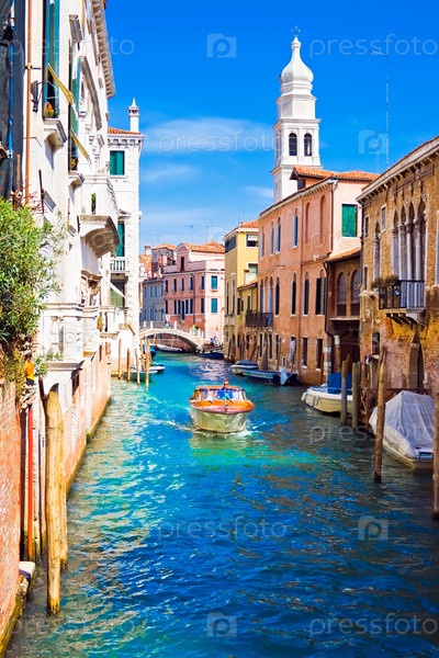 Моторная лодка в красивом канале, Венеция, Италия