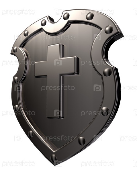 Металлический щит с христианским крестом на белом фоне - 3d иллюстрация