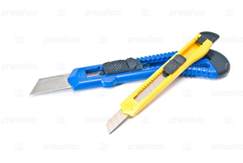 Желтый и синий канцелярский нож на белом