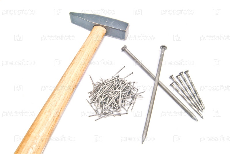 Деревянный молоток и гвозди на белом