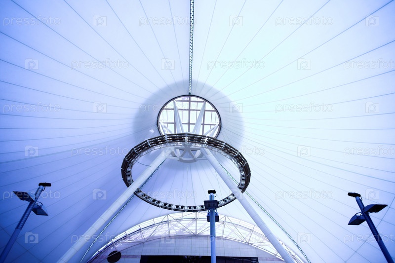 Синий необычный геометрический потолок офисного здания