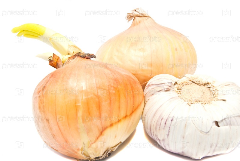 Лук и чеснок крупным планом на белом