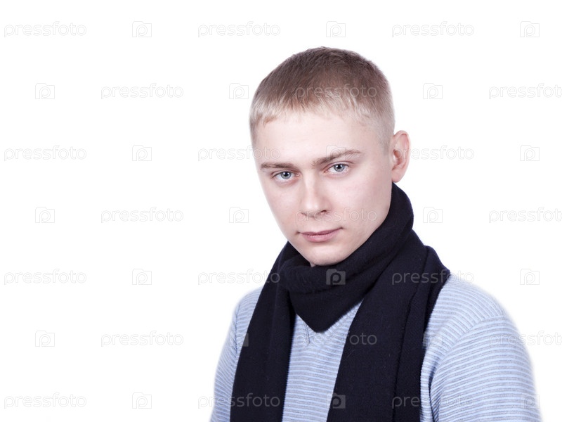 Молодой человек в голубом свитере и черном шарфе