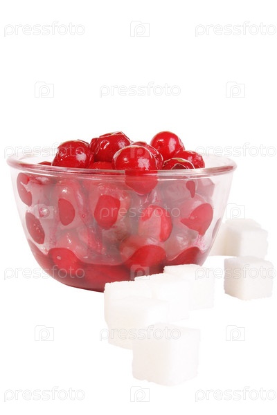 Замороженная вишня и сахар рафинад на белом фоне