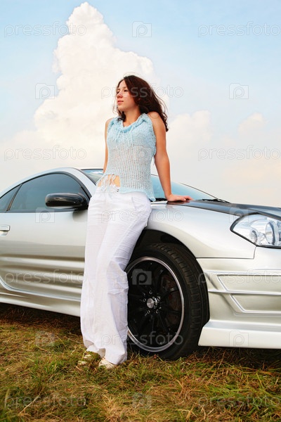 Женщина стоит у спортивного автомобиля