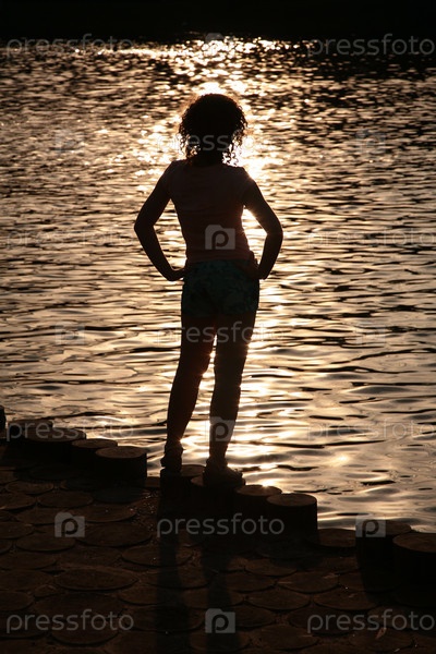 Женский силуэт у воды на закате
