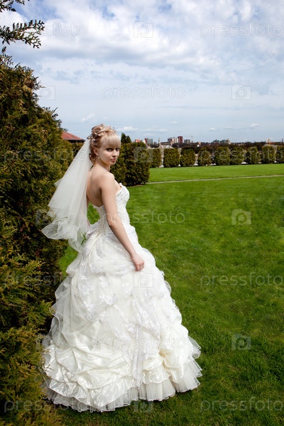 Девушка в свадебном платье в саду