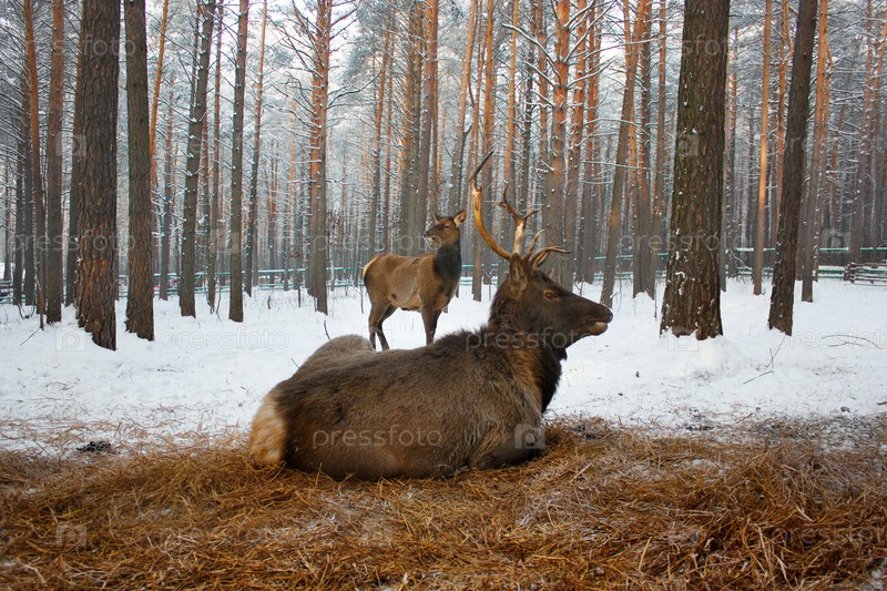Семья из двух алтайских маралов зимой в заповеднике