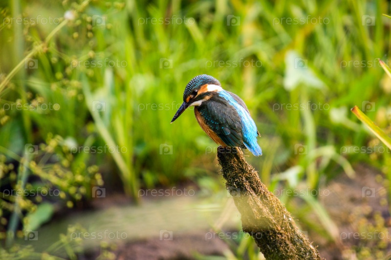 Зимородок на мшистой коряге высматривает добычу