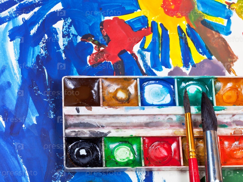 Акварельный набор и две кисточки на детском рисунке