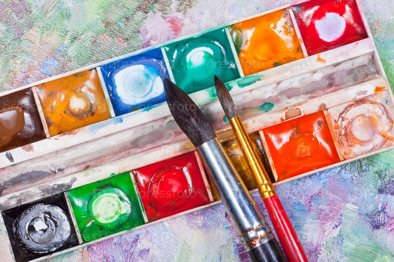Акварельный набор и две кисточки на детском рисунке