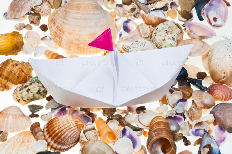 Бумажный кораблик на фоне морских ракушек