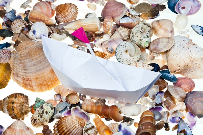 Бумажный кораблик на фоне морских ракушек