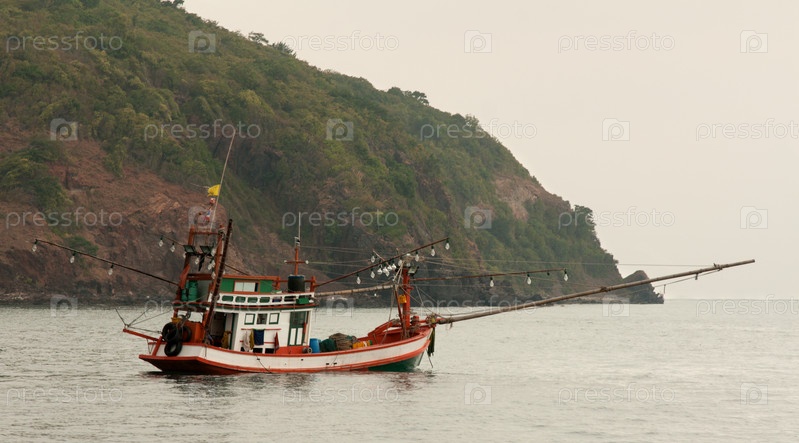 Рыбацкая лодка на фоне острова и серого пасмурного неба