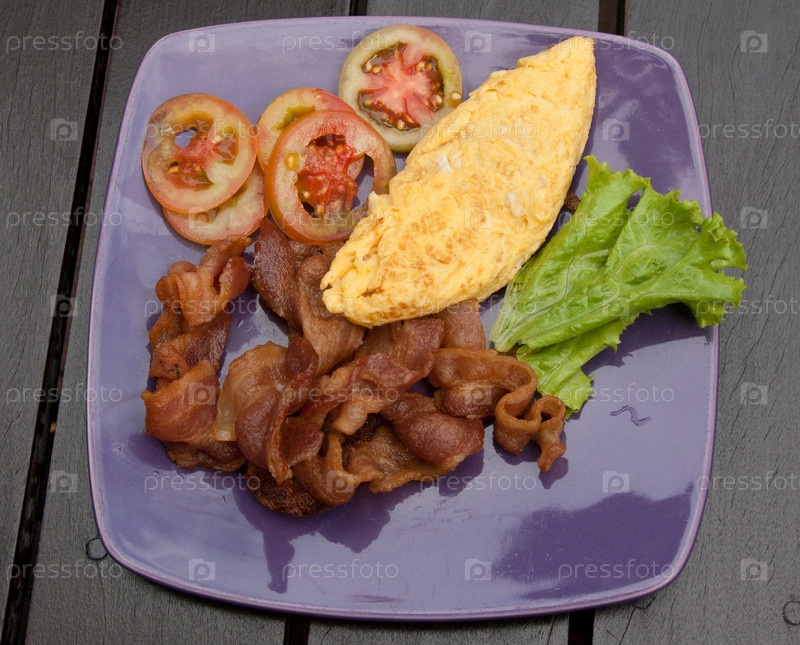 Омлет с жареным мясом и помидорами на фиолетовой тарелке