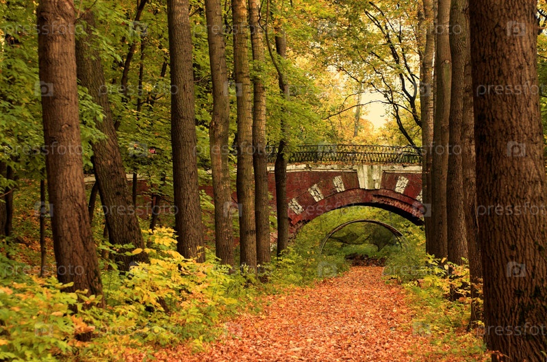 Кирпичный мост в осеннем лесу России