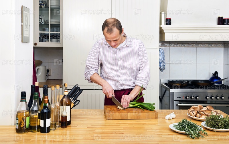 Мужчина режет лук в кухне