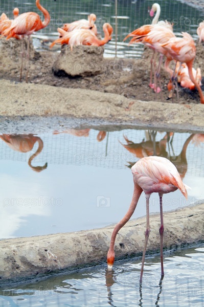 Птицы фламинго в зоопарке летом