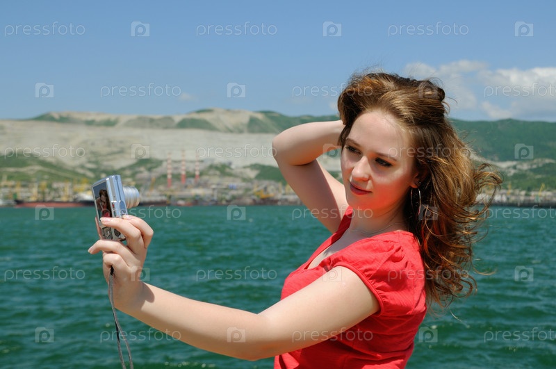 Девушка фотографирует себя на фоне моря
