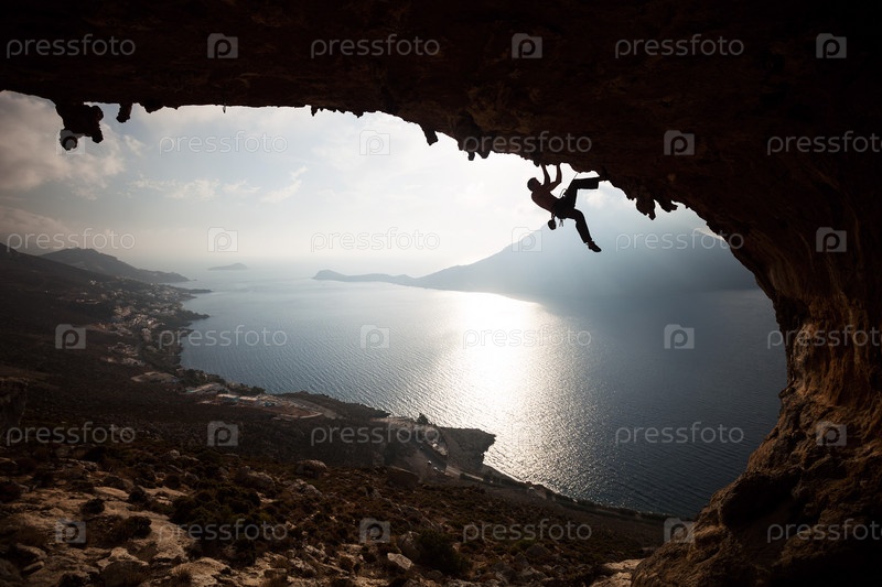 Силуэт альпиниста на закате. Остров Калимнос, Греция
