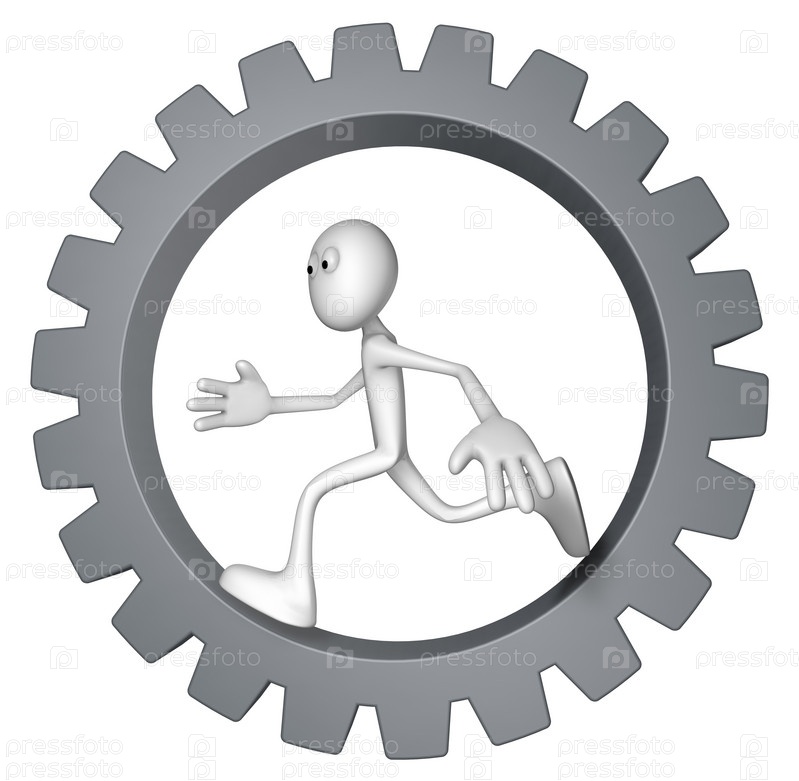 Белый парень бежит внутри зубного колеса - 3d иллюстрация