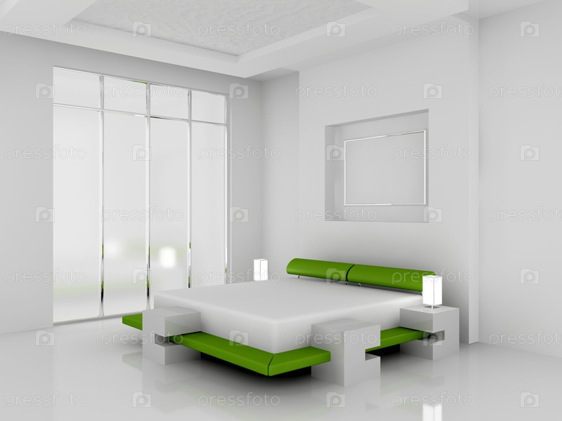 Современный интерьер спальной комнаты в бело-зеленом стиле