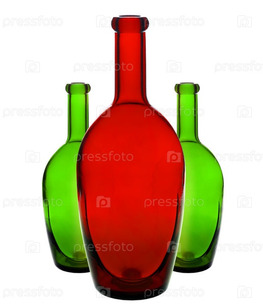 Цветные стеклянные бутылки, красный и зеленый на белом фоне
