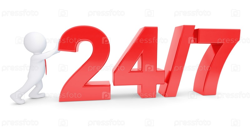 Белый 3d человек толкает красный текст круглосуточно, семь дней в неделю