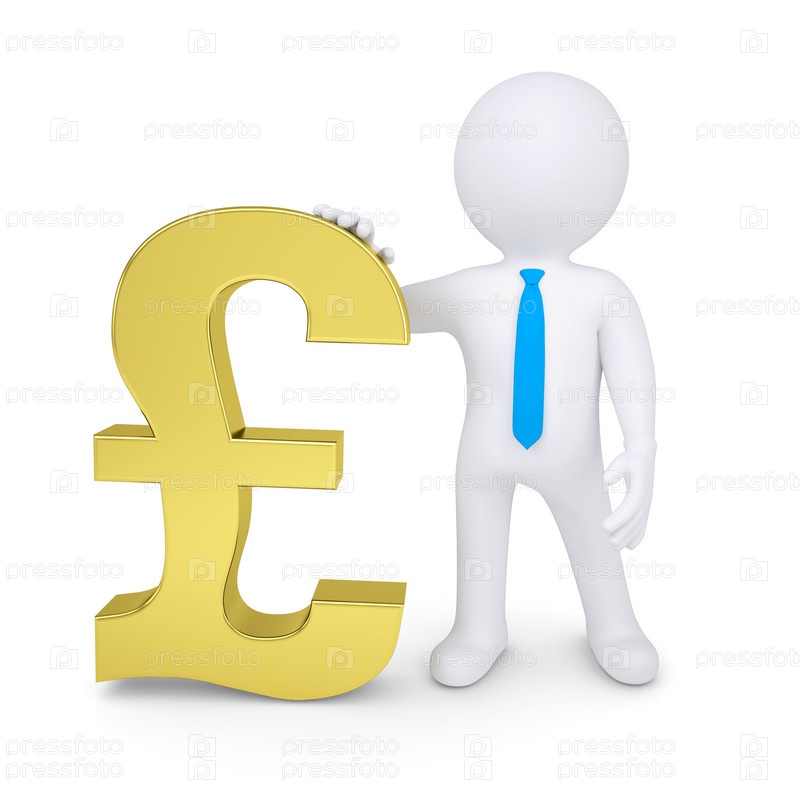Белый трехмерный человек у золотого знака фунта