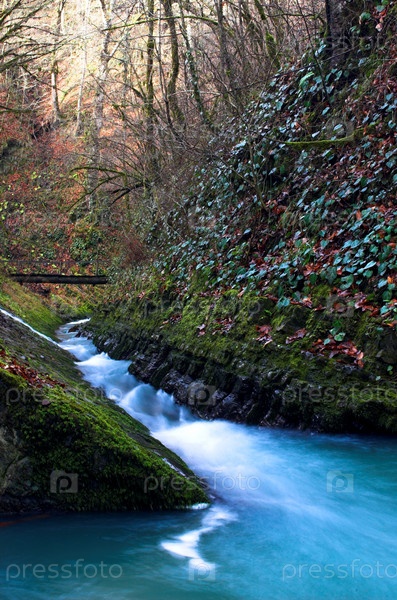 Водопад с мостом и скалой