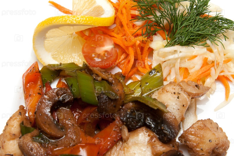 Блюдо с жареным мясом, помидорами и салатом на белом фоне