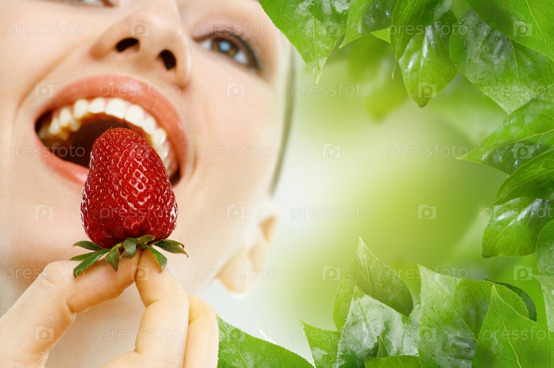 Женщина наслаждается спелой клубникой