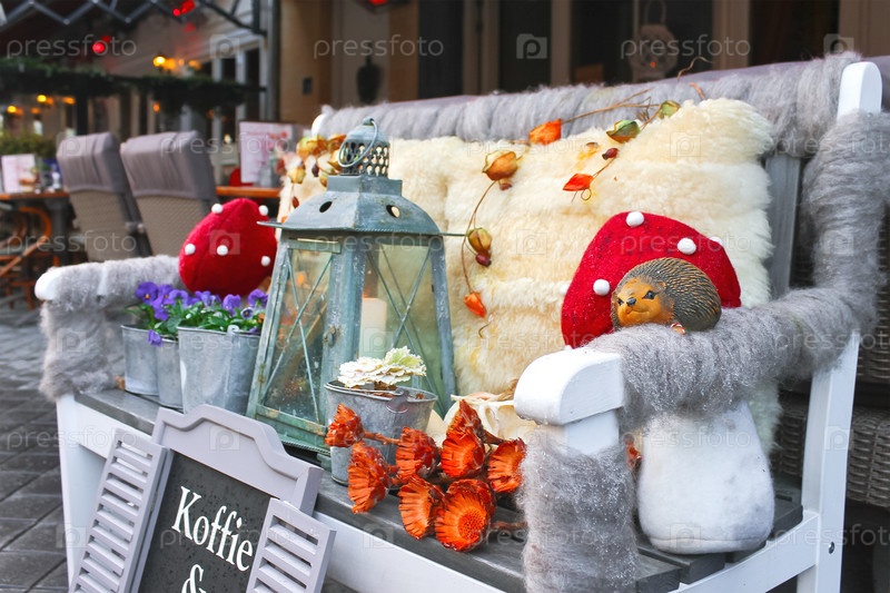 Скамейка с декоративными украшениями рядом с рестораном в Валкенбурге. Нидерланды