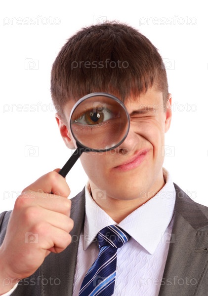 Молодой бизнесмен смотрит через увеличительное стекло