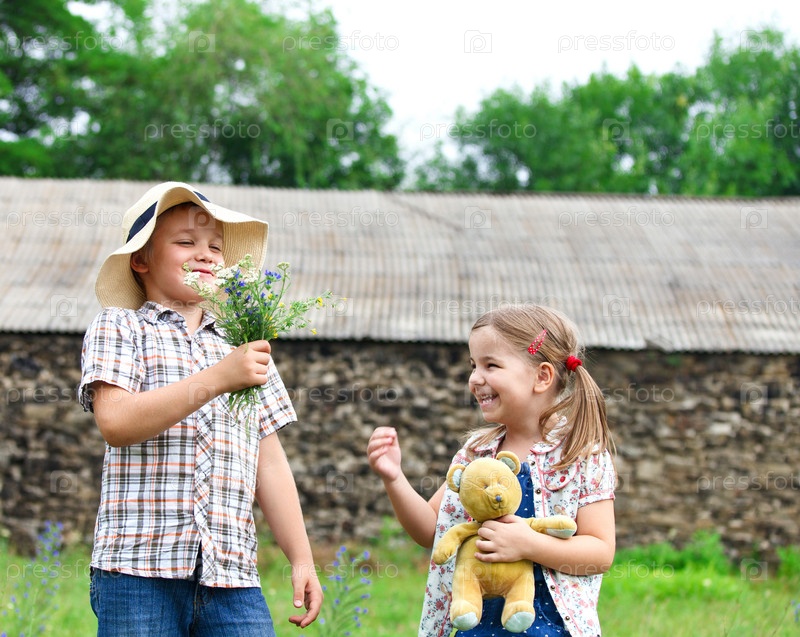 Маленький мальчик дает девочке цветы