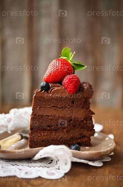Кусок шоколадного торта с глазурью и свежими ягодами