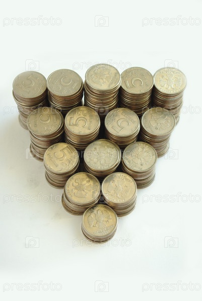 Пятирублевые монеты на белом фоне