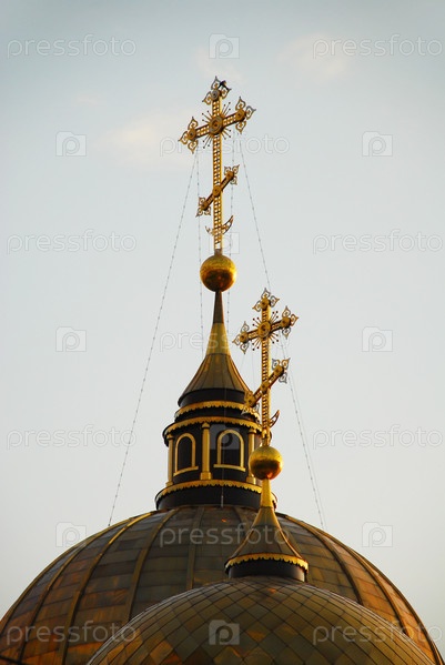 Золотые купола с крестами на фоне неба