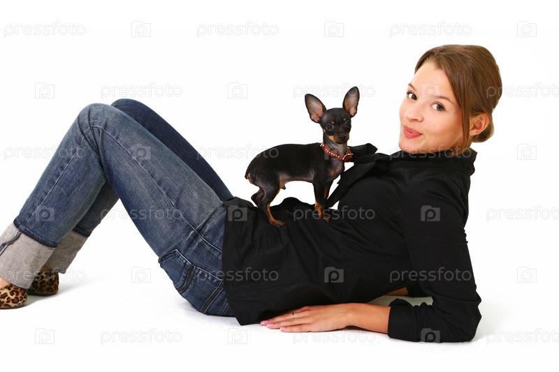 Красивая молодая женщина с милой собачкой, изолированные на белом фоне