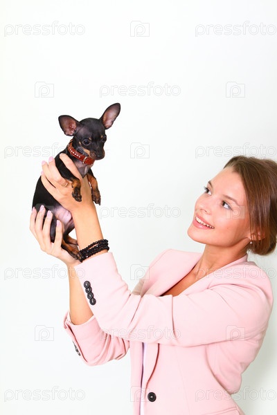 Хорошенькая молодая женщина с небольшой собакой, изолированная на белом фоне