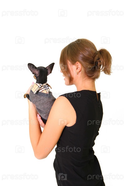 Хорошенькая молодая женщина с чихуахуа, изолированные на белом фоне
