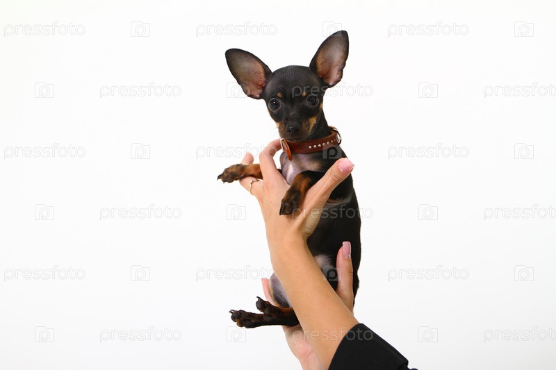 Маленькая собака в костюме в руках, изолированная на белом фоне