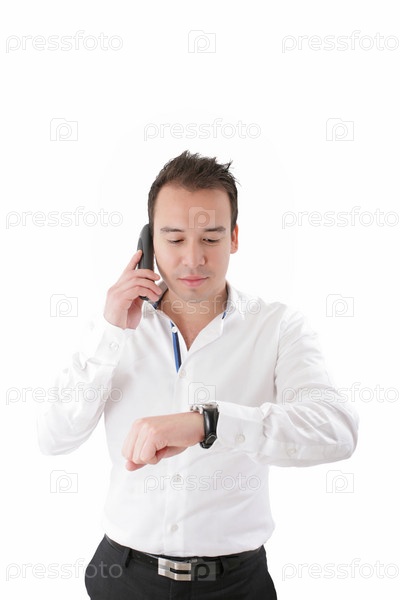 Бизнесмен смотрит на часы, изолированный на белом фоне