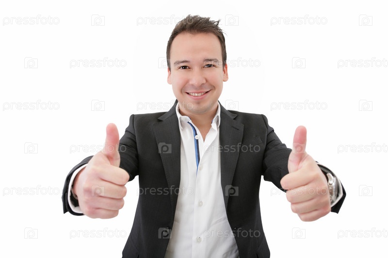 Улыбающийся молодой человек с пальцами вверх, изолированный на белом фоне